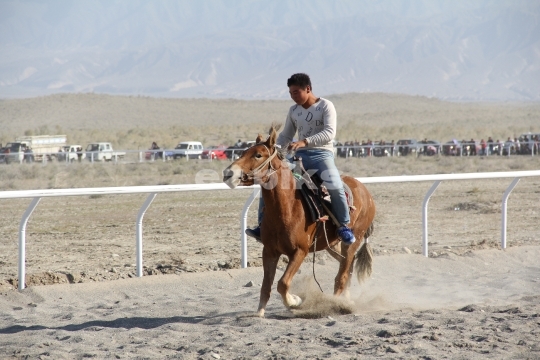 Xinjiang Province, China - 09-20-2011 Horses running in a free race on a sand track in Xinjiang province in northern China; a province that has a long history of horse breeding and horse riding.