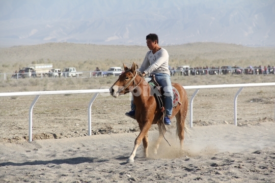 Xinjiang Province, China - 09-20-2011 Horses running in a free race on a sand track in Xinjiang province in northern China; a province that has a long history of horse breeding and horse riding.