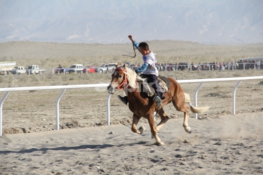 Xinjiang Province, China - 09-20-2011 Horses running in a free race on a sand track in Xinjiang province in northern China; a province that has a long history of horse breeding and horse riding.