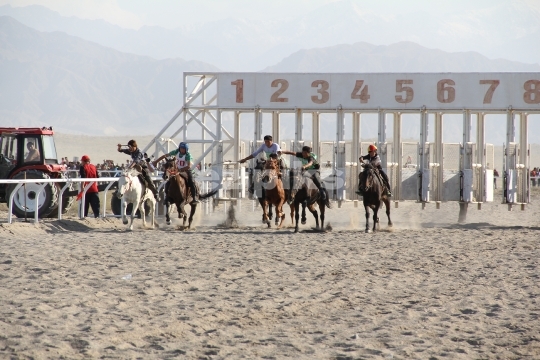Xinjiang Province, China - 09-20-2011 Horses running in a free race on a sand track in Xinjiang province in northern China; a province that has a long history of horse breeding and horse riding.