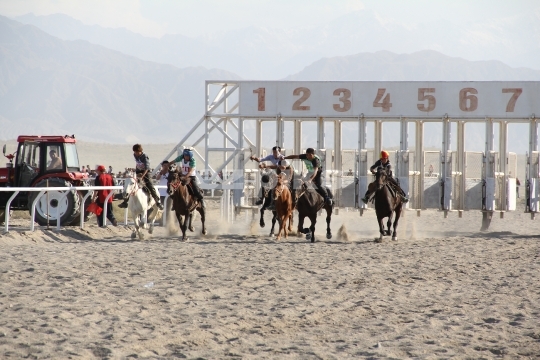 Xinjiang Province, China - 09-20-2011 Horses running in a free race on a sand track in Xinjiang province in northern China; a province that has a long history of horse breeding and horse riding.