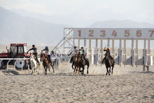 Xinjiang Province, China - 09-20-2011 Horses running in a free race on a sand track in Xinjiang province in northern China; a province that has a long history of horse breeding and horse riding.