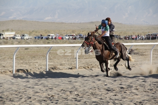 Xinjiang Province, China - 09-20-2011 Horses running in a free race on a sand track in Xinjiang province in northern China; a province that has a long history of horse breeding and horse riding.