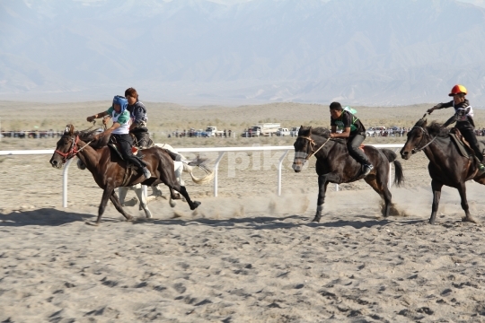 Xinjiang Province, China - 09-20-2011 Horses running in a free race on a sand track in Xinjiang province in northern China; a province that has a long history of horse breeding and horse riding.