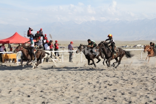 Xinjiang Province, China - 09-20-2011 Horses running in a free race on a sand track in Xinjiang province in northern China; a province that has a long history of horse breeding and horse riding.
