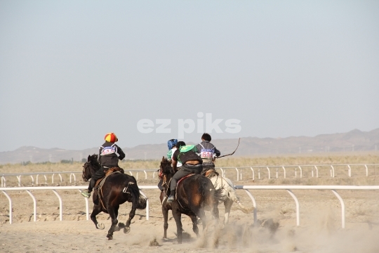 Xinjiang Province, China - 09-20-2011 Horses running in a free race on a sand track in Xinjiang province in northern China; a province that has a long history of horse breeding and horse riding.