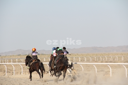 Xinjiang Province, China - 09-20-2011 Horses running in a free race on a sand track in Xinjiang province in northern China; a province that has a long history of horse breeding and horse riding.