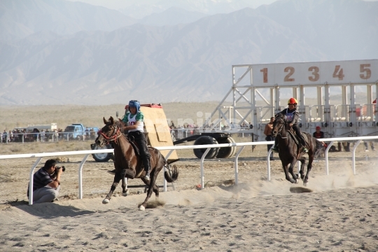Xinjiang Province, China - 09-20-2011 Horses running in a free race on a sand track in Xinjiang province in northern China; a province that has a long history of horse breeding and horse riding.