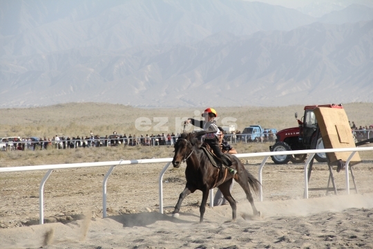 Xinjiang Province, China - 09-20-2011 Horses running in a free race on a sand track in Xinjiang province in northern China; a province that has a long history of horse breeding and horse riding.