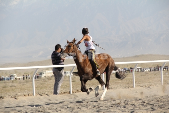 Xinjiang Province, China - 09-20-2011 Horses running in a free race on a sand track in Xinjiang province in northern China; a province that has a long history of horse breeding and horse riding.