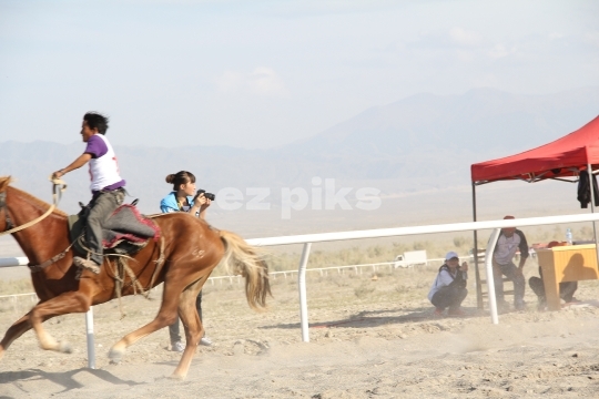 Xinjiang Province, China - 09-20-2011 Horses running in a free race on a sand track in Xinjiang province in northern China; a province that has a long history of horse breeding and horse riding.