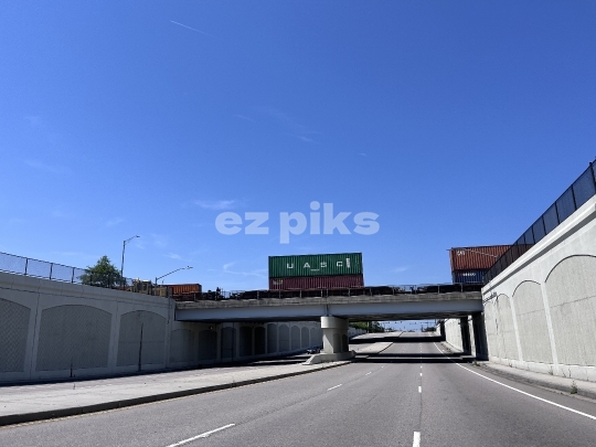 Norfolk, VA, USA - 05222024 A freight train passing a flyover loaded with shipping containers.