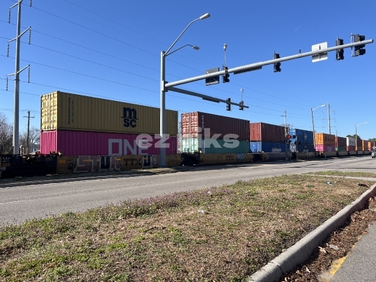 Norfolk, VA, USA - 03-11-2025: Shipping containers loaded on freight train cars.