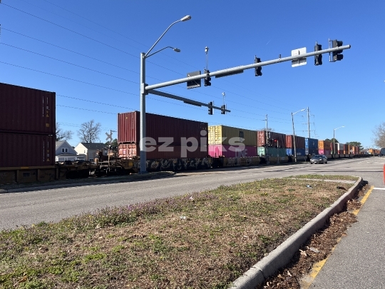Norfolk, VA, USA - 03-11-2025: Shipping containers loaded on freight train cars.