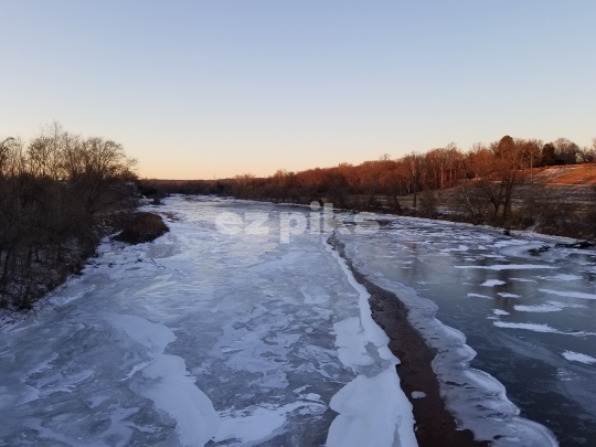 Frozen water of Rappahannock river in Fredericksburg, VA, USA.