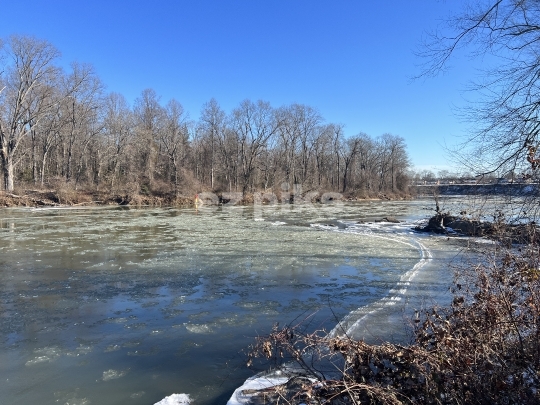 Fredericksburg, VA, USA - 01-22-2024 Ice covering the Rappahannock River as a sever cold front hit many parts of United States east coast.