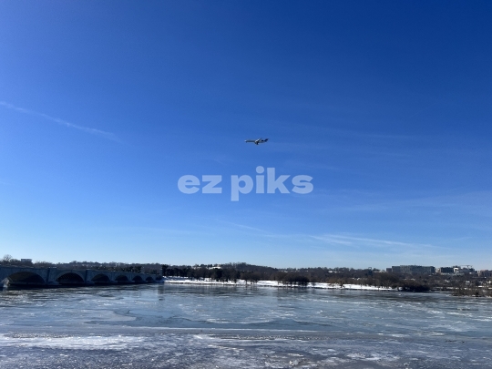 Washington DC, USA - 01-22-2024 A passenger plane flying over the frozen waters of the Potomac River.
