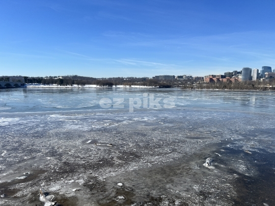 Washington DC, USA- 01-22-2024 Frozen Potomac river in winter of 2024. Key bridge appears in the distance.