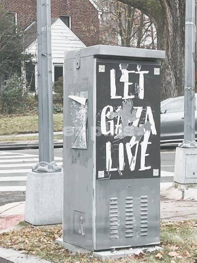 Washington DC, USA - 12022023 A sabotaged sticker on a power generator that reads Let Gaza Live .