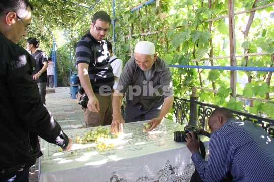 Xinjiang, China - 09/18/2011: A Chinese Muslim grower shows off his grapes to visitors at his vineyard.