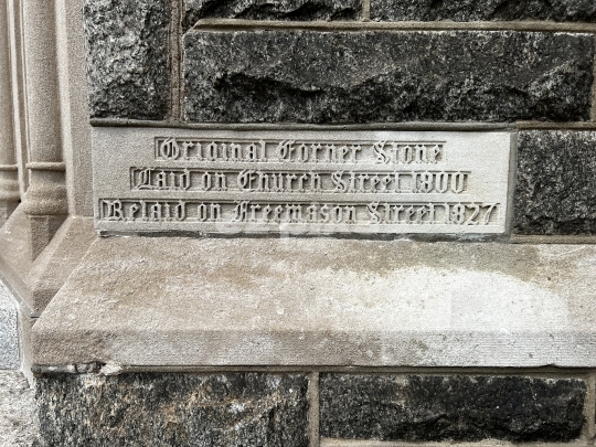 Norfolk, VA, USA - 10-10-2024 Engraved marble on the external wall of a Church in downtown Norfolk city in south easter Virginia