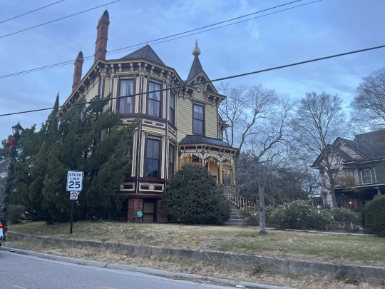 Wright Island, VA, USA - 12-04-2025 Victorian-style home featuring yellow siding, dark trim, and prominent chimneys, set against a cool, overcast sky.