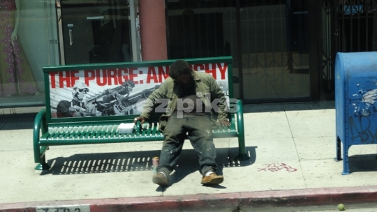 LA, CA, USA- 07-05-2014 A homeless person taking a nap sitting on a street bench in downtown LA, in California, USA.
