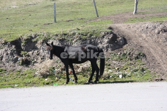 Wild black filly looking at crew.