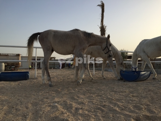Rescue horses being taken care of in a desert stable in Qatar.