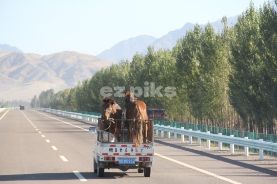 Xinjiang, China - 09-19-2011 Two chestnut horses being transported using a small pickup truck.