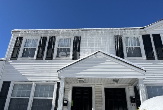 Newport News, VA, USA - 02/21/2025: Ice drips are seen dangling from the roof of a house after unusual winter storm in southeast Virginia USA.