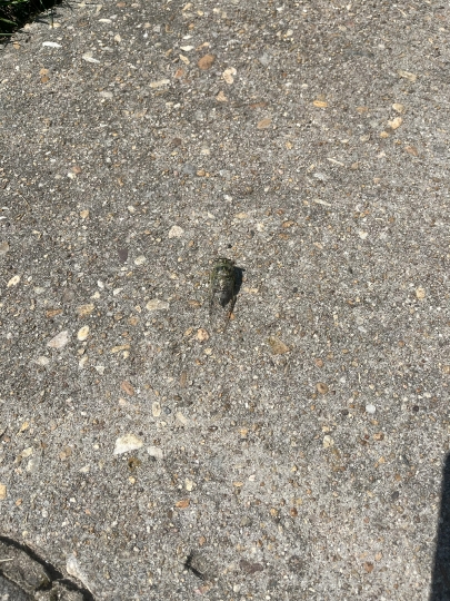 Close-up view of an insect, likely a newly emerged cicada, on gray pavement featuring small embedded stones.