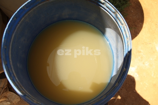 Close-up view inside a drinking water bucket in a camp for Syrian refugees in Qibb Ilyas (Qab Ilyas).