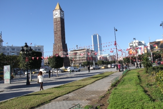 Tunis, Tunisia - February 4, 2013 Pedestrians walk past clock tower of Istiqlal Roundabout in downtown Tunis, Tunisia.