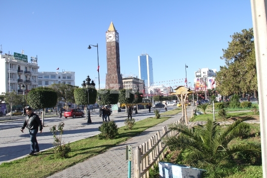 Tunis, Tunisia - February 4, 2013 Pedestrians walk past clock tower of Istiqlal Roundabout in downtown Tunis, Tunisia.
