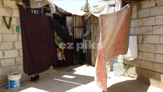 Barelias, Lebanon - 08-04-2024 A child Syrian refugee looking at used water bottles in front of an unfinished house used as a shelter by Syrian refugees.