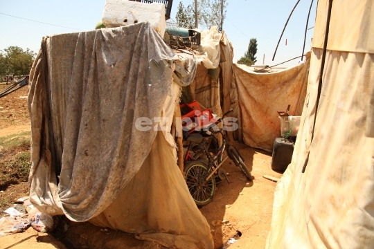 Barelias, Lebanon- 07-30-2014 A bike under rugs covering a tent inside a Syrian refugee camp in Barelias, a town on the Lebanese-Syrian borders.