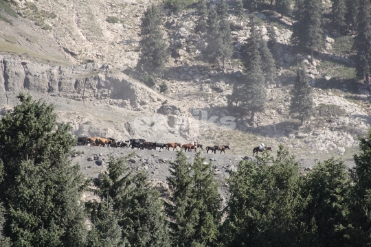 Xinjiang, China 09-19-2011 Cattle of horses and cows traveling down a road in Xinjiang, China