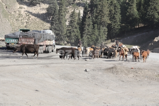 Xinjiang, China 09-19-2011 Cattle of horses and cows traveling down a road in Xinjiang, China