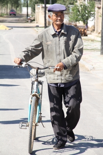 Yining, China, Xinjiang- 09-17-2011 An old man walks next to his bicycle.
