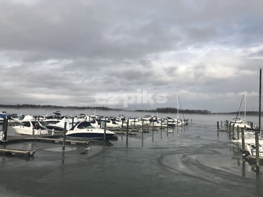 Woodbridge, VA, USA- 11-02-2018 Boats at a marina with heavy fog covering Potomac river.