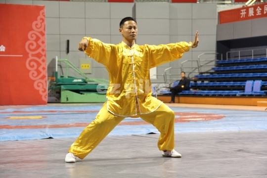 Xinjiang, China - 09/20/2011: A man wearing a traditional yellow Tai Chi uniform performs martial arts.