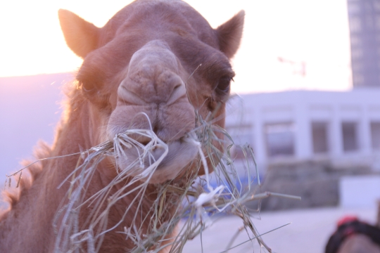 Close-up photograph of a camel actively chewing a mouthful of dry straw or hay.