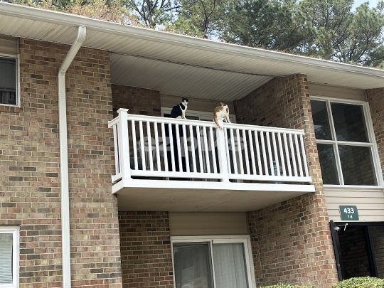 Hampton, VA,USA- 04-05-2025: Two domestic cats sitting on a balcony guardrails watching what is happening in the neighborhood.
