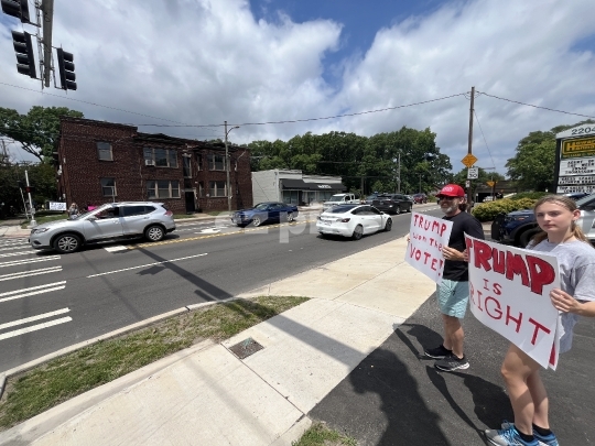 Norfolk, VA, USA - 06-14-2025 Two pro US President Donald Trump demonstrators standing across the road from anti- Trump demonstrators taking part in no king demonstration in downtown Norfolk city in southeast Virginia, USA.