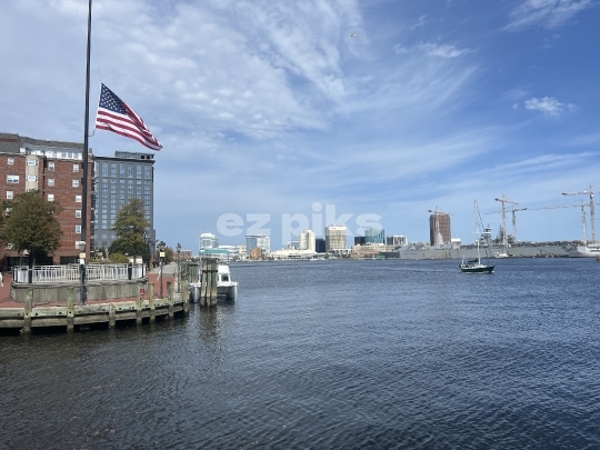 Portsmouth, VA, USA - 11-01-2024 Norfolk citys downtown high rise buildings appears on the other side of the water.