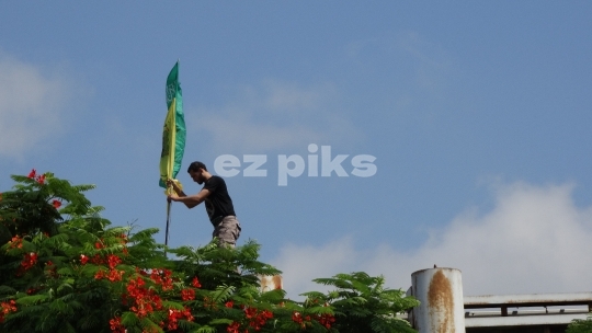Beirut, Lebanon- 07-24-2014 A man with Palestinian flag on top of building as part of a protest against IsraelGaza conflict, also known as Operation Protective Edge and sometimes referred to as the 2014 Gaza war.