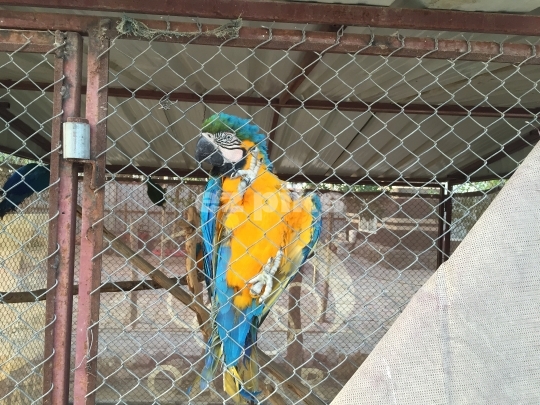 Colorful parrot climbing his cage fence.