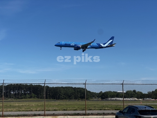 Norfolk, VA, USA- 06-16-2024: A Breeze Airways plane with released landing gear seconds before landing in Norfolk airport in Virginia state, USA.
