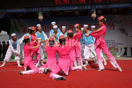Turpan, Xinjiang, China - 09/20/2011: Chinese men and women performing traditional dance as part of street festival.